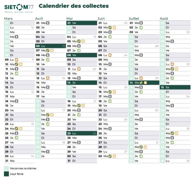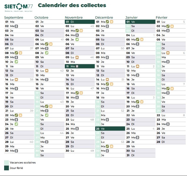 La collecte des déchets s'effectue selon le calendrier suivant :